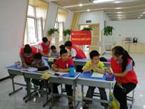 8月18日上午8:00,实践队队员于红山区铁南街道南山社区党群服务中心内的“四点半学堂”集合,开展志愿服务社会实践活动。