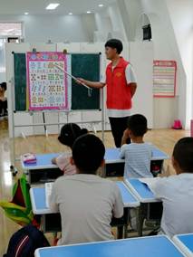 队员们首先对“四点半学堂”的基本职能、创建历史与服务理念进行学习,了解到该项目是南山社区联合党委对接部门服务理念、下沉部门优质资源而建立的一项服务回迁居民子女的融合党建项目,主要为回迁居民子女提供家庭作业辅导、图书阅读、特色主题活动等服务,承接了团区委青年志愿服务和区科协青少年科技馆等项目服务功能。“四点半学堂”项目的启动,创新了基层党建服务模式,助推联合党委融台党建群众服务工作再上新台阶。在第二天的社会实践活动中,同学们接受了一项全新的挑战,是一次意义非凡的体验。他们在学堂里教小朋友们认汉字、学英语,辅导他们完成暑期作业,耐心认真地解答小朋友们提出的疑惑,为小朋友营造了一个轻松愉快的学习氛围、享受学习的乐趣,同时队员们也体会到了教师工作的辛苦与不易。学习之余,队员们还带领孩子们做游戏,缓解小朋友们的压力。在游戏过程中,气氛热烈、笑声不断,第二天的志愿服务社会实践活动在实践队与小朋友们的合影中圆满结束。