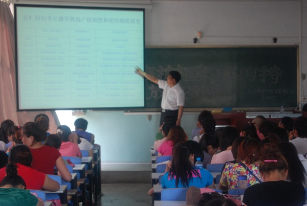 在讲座中,达林太教授为同学们介绍了干旱草场的一些基本特征,指出干旱区草场的初级生产是以小禾草和灌木的形式生产饲料在年际之间和不同地点之间存在剧烈变化。放牧畜牧业主要以移动式存在,长距离的迁徙移动是放牧畜牧业主要的识别特征,使用共有(或私有)草场资源包括使用共有产权模式。达林太教授还强调要从社会经济学的角度看放牧畜牧业的价值,放牧畜牧业文化的固有价值与特定社区中个人的利益相关价值。最后,达以太教授以内蒙古干旱区阿拉善地区的放牧畜牧业为例,进行了较为详细的讲解并针对阿拉善地区的放牧畜牧业存在的问题提出了相应的策略。