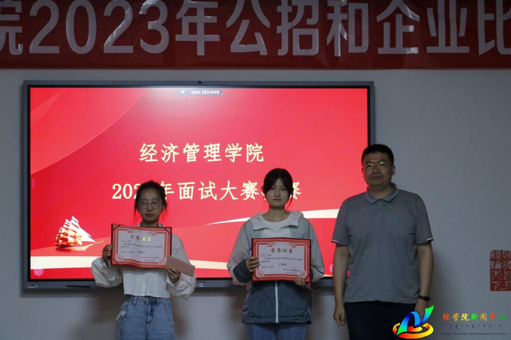 最终,企业面试赛道中张原同学获得一等奖,康楚悦同学获得二等奖,张思梦、李泽敏同学获得三等奖。公考面试赛道中张轶晗同学获得一等奖,任佳敏同学获得二等奖,余靖禹、张思梦同学获得三等奖。