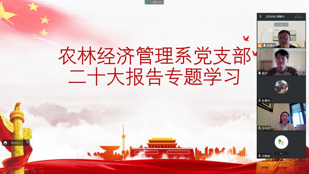 为了将党的二十大精神落实到具体工作中,农经支部于2022年12月18日举行了线上会议,会议由党支部书记刘贺贺主持,全体党员重温了二十大精神,并就如何将党的二十大精神与自身工作结合、如何落实到具体而微的实际行动中而展开了热烈的讨论。全体党员一致认为,我们应该加强理论学习,永葆作为中国共产党党员的崇高初心。大家还就如何在“乡村振兴”、经济高质量增长的国家战略中发挥自己的专业技能、贡献自己的力量提出了很多有建设性的意见和建议。大会讨论气氛热烈,达成了很多共识。党员同志们纷纷表示,在日常的科研与教学工作中,要以一名优秀共产党员的要求严格要求自己,老老实实做人,认认真真干事。