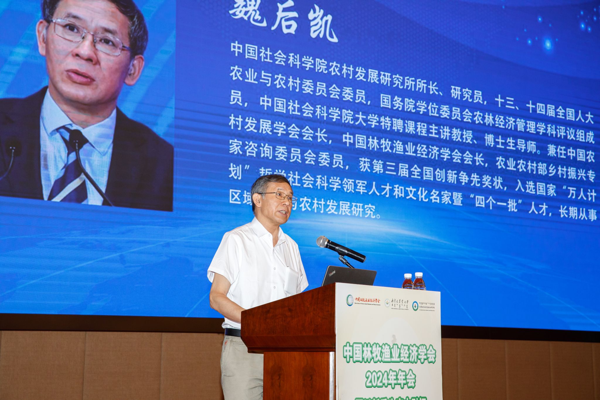 开幕式后,与会专家学者围绕如何以新质生产力引领林牧渔草业现代化发展进行主旨报告。中国林牧渔业经济学会会长、中国社会科公司农村发展研究所所长魏后凯就新质生产力在现代化大农业中的作用进行深入解读,强调新质生产力的科学内涵和基本特征,提出发展现代化大农业的多元化模式。其后,浙江农林大学教授张俊飚、国家林业和草原局发展研究中心副主任刘璨、农业农村部农村经济研究中心副主任陈洁做了主旨发言,围绕新时期农业绿色低碳发展、集体林权制度改革、渔业现代化建设等议题进行了分析,并提出了加强前沿技术研发、完善补贴政策、推动学科交叉融合等建议。