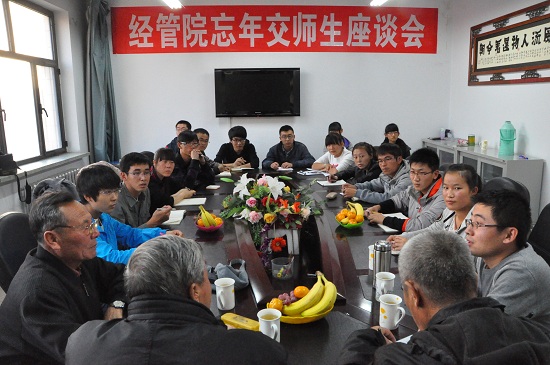 11月1日下午4:30,经管院在办公楼四楼会议室召开了忘年交师生座谈会。校关工委副秘书长李宗信、马世兴,院关工委主任赵国年、常委副主任达楞浩雅尔、院关工委秘书张卫中老师以及11级、12级部分党员代表共计16人参加了此次座谈会。