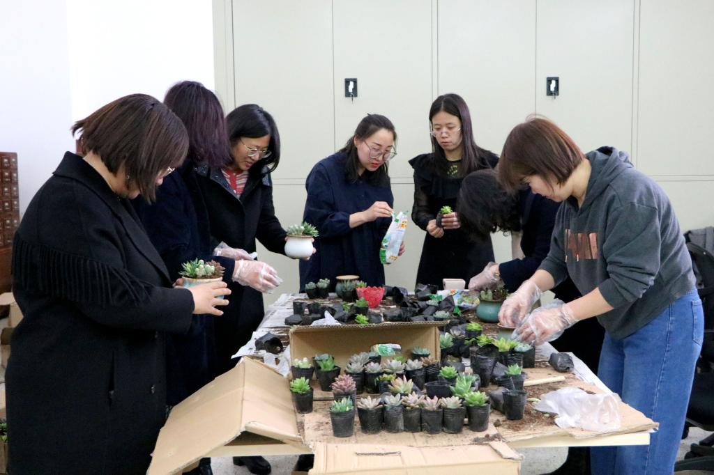 活动中,女教职工在插画老师的指导下,按照个人喜好、植物特性以及色彩搭配等仔细挑选心仪的多肉植物,动手完成了培土、栽种、装饰等一系列流程。老师们发挥想象,变身巧手花匠,在轻松愉快的氛围中,一盆盆布局合理、株型错落、颜色协调的多肉盆栽展现在眼前,更显活泼生机、盎然春意。老师们分享着自己的DIY成果,纷纷与自己的绿植作品合影留念,活动在欢声笑语中走向尾声。