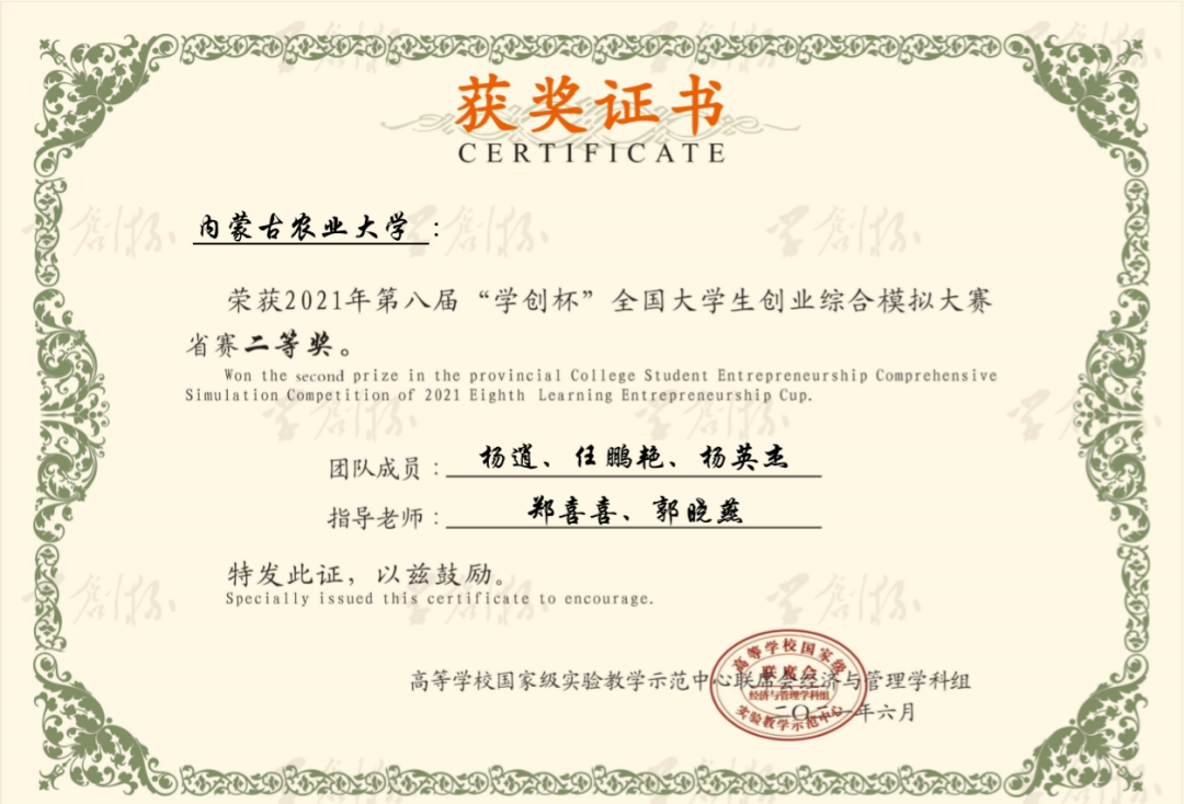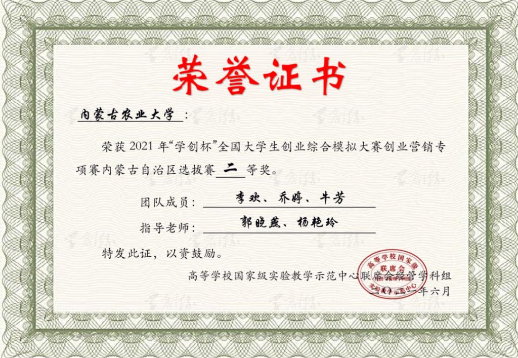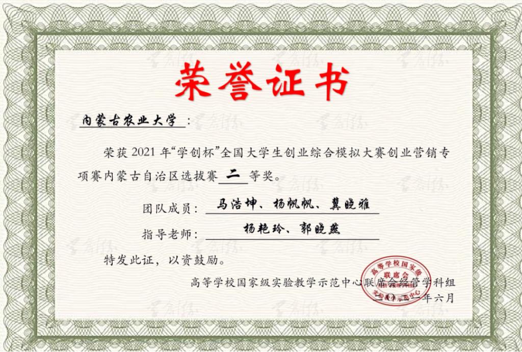 公司企模社团指导老师郑喜喜、杨艳玲两位老师带6支队伍参加第八届“学创杯”全国老员工创业综合模拟大赛,其中参加创新创业主赛道的有3支队伍,参加市场营销专项的有3支队伍。在为期一天的高强度比赛中,公司学子迎难而上、克服压力,接受着技术与耐力的考验,最终公司19级工商1班杨逍、19级财管1班杨英杰、19级财管2班任鹏艳荣获第八届“学创杯”全国老员工创业综合模拟大赛省赛二等奖,19级工商1班牛芳、19级电商2班李欢、19级电商1班乔婷、19级经济1班马浩坤、19级财管1班冀晓雅、19级会计1班杨帆帆荣获第八届“学创杯”全国老员工创业综合模拟大赛创业营销专项赛内蒙古自治区选拔赛二等奖。