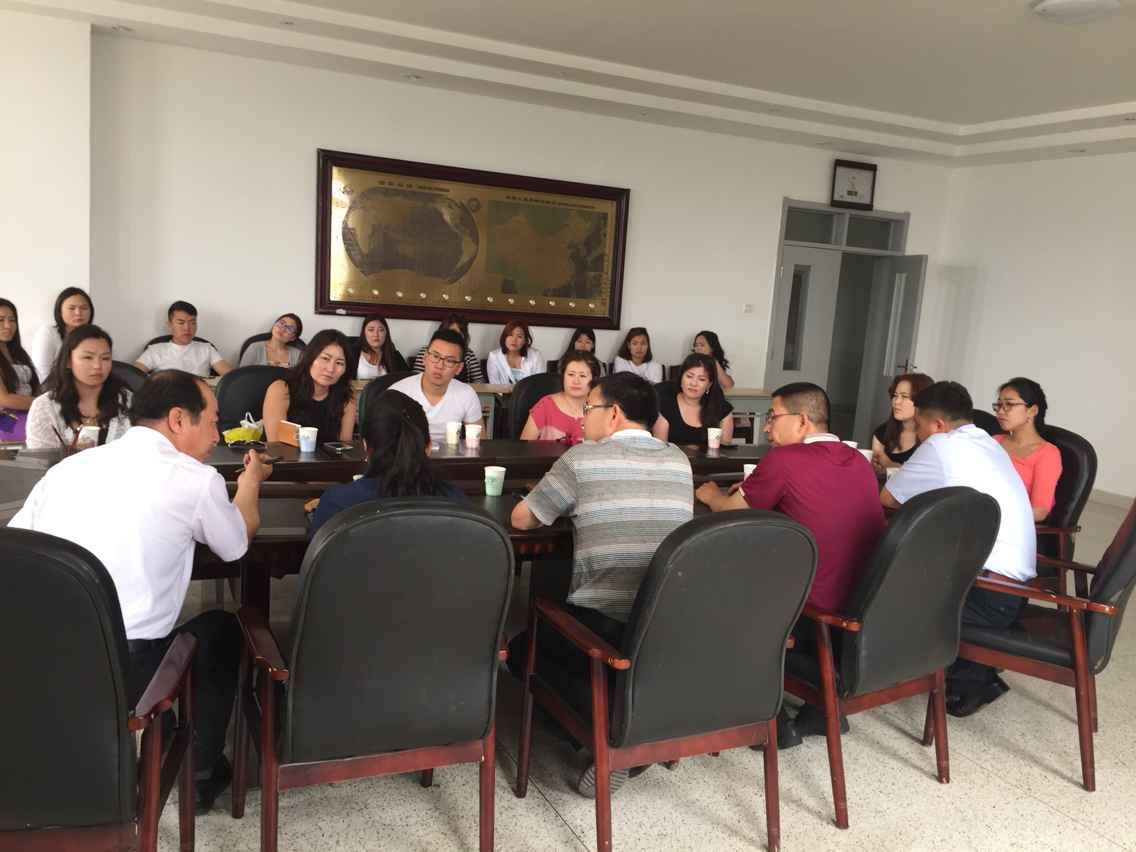 根据经管院与蒙古国生命科学大学的合作协议,双方互派本科生进行教员工产实习,蒙古国生命科学大学教学实习团在阿拉坦图雅、巴雅尔其木格、恩和图雅三位老师的带领下携16位员工顺利抵达公司,开始了为期9天的教员工产实习活动。6月23日上午10:00,经管院于五楼会议室召开座谈会,党委书记赵国年、经理乔光华、副经理宝音以及胡尔查老师、包慧敏老师出席本次会议。